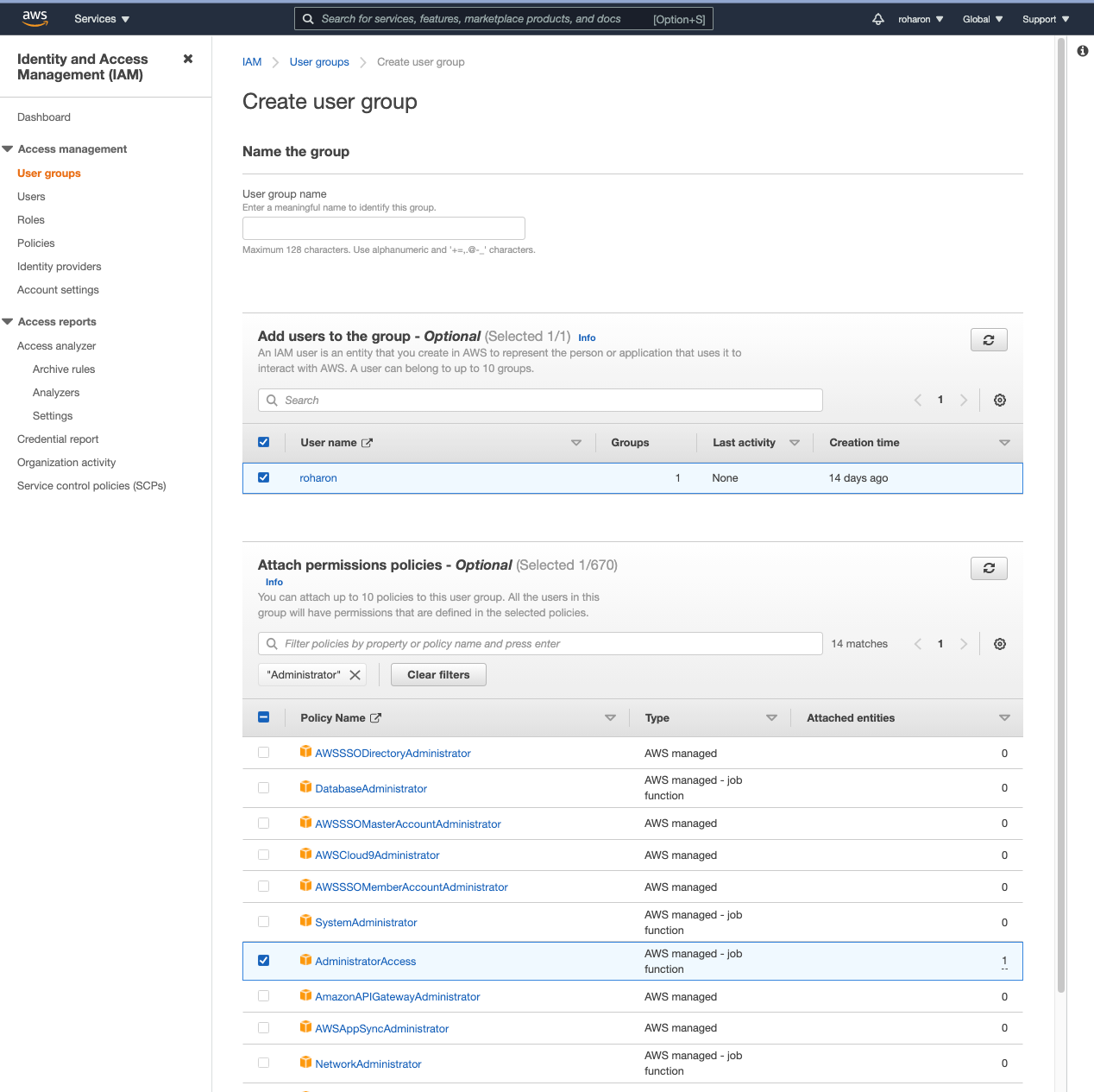 유저 그룹 이름을 지정하고, 방금 만든 유저를 선택한다. 권한 정책은 AdministratorAccess 로 지정해둔다.