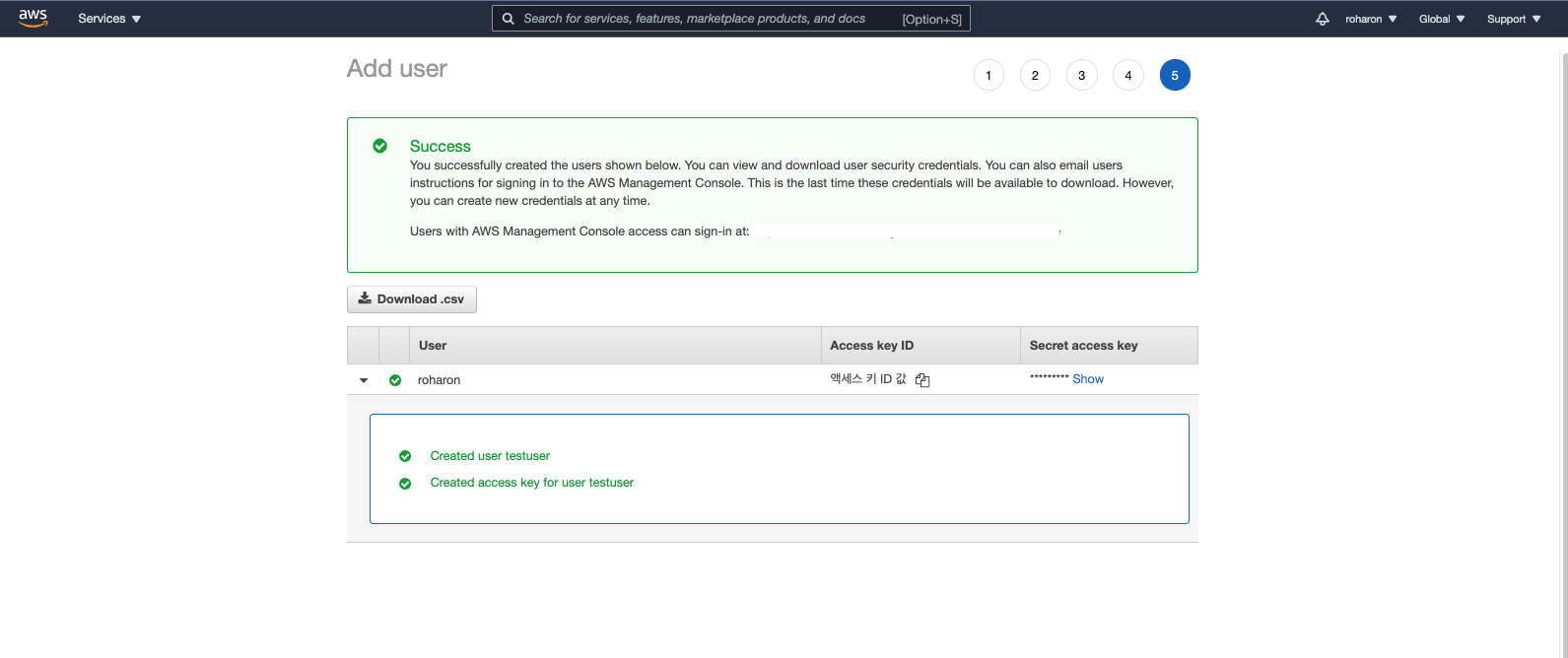 Secret access key는 이 페이지에서만 조회가 가능하며, 이후에는 값을 확인할 수 없으므로 Download .csv 버튼을 눌러 csv 파일로 저장을 해둔다.
