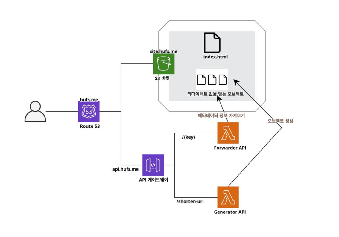 람다를 이용해 단축 URL 생성, URL 전달 기능을 구현하고, API Gateway에 연결하여 API 엔드포인트로 제공한다