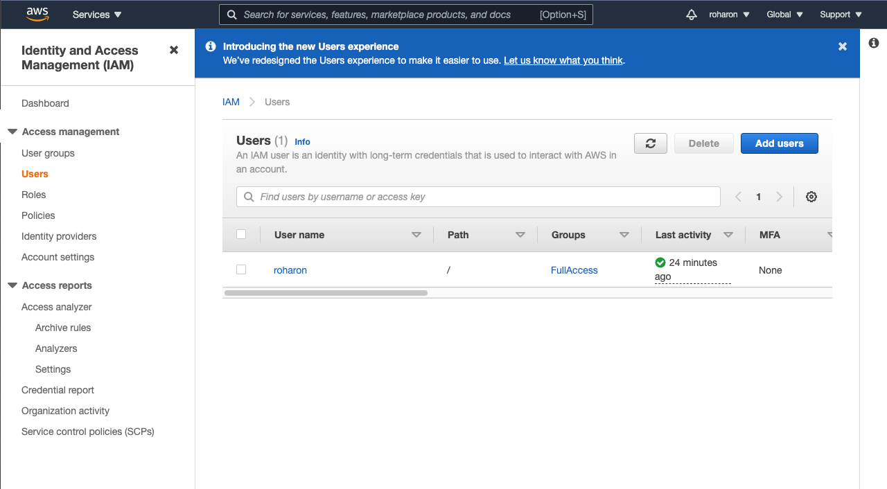 그럼 이제 AWS CLI에 credential을 입력하기 위해 AWS의 IAM에 접속한다