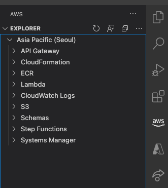 AWS profile 연결이 되었다면 아래와 같이 AWS 익스텐션의 Explorer에 다음과 같이 나오는 것을 확인할 수 있다