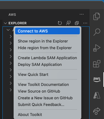 이제 Vscode의 Toolkit 익스텐션의 Option(...버튼)에서 Connect to AWS를 눌러 방금 만든 profile을 지정한다.