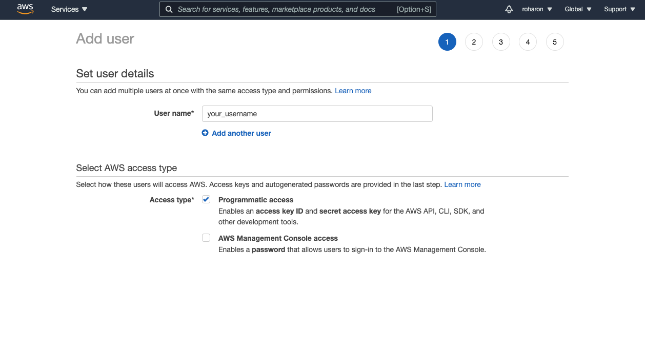 사용자를 추가하기 위해 Add Users를 눌러 이름을 입력하고, AWS Access type에서 Programmatic access를 체크한다.