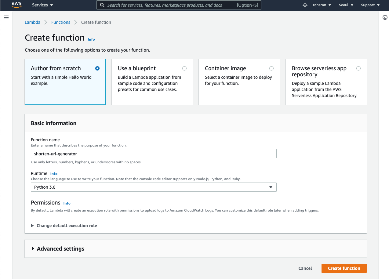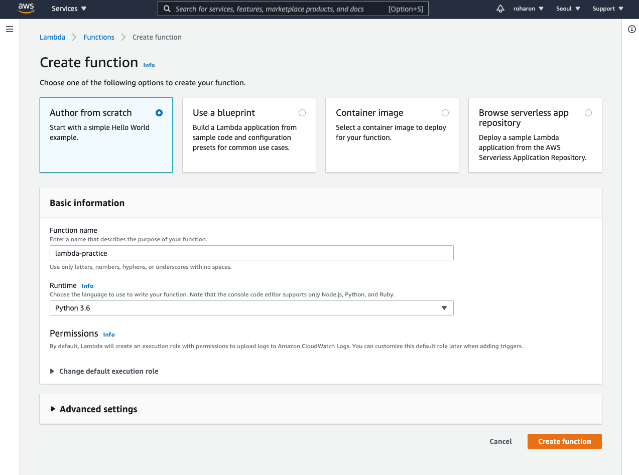 Author from scartach를 누르고, 함수 이름과 런타임을 지정한다