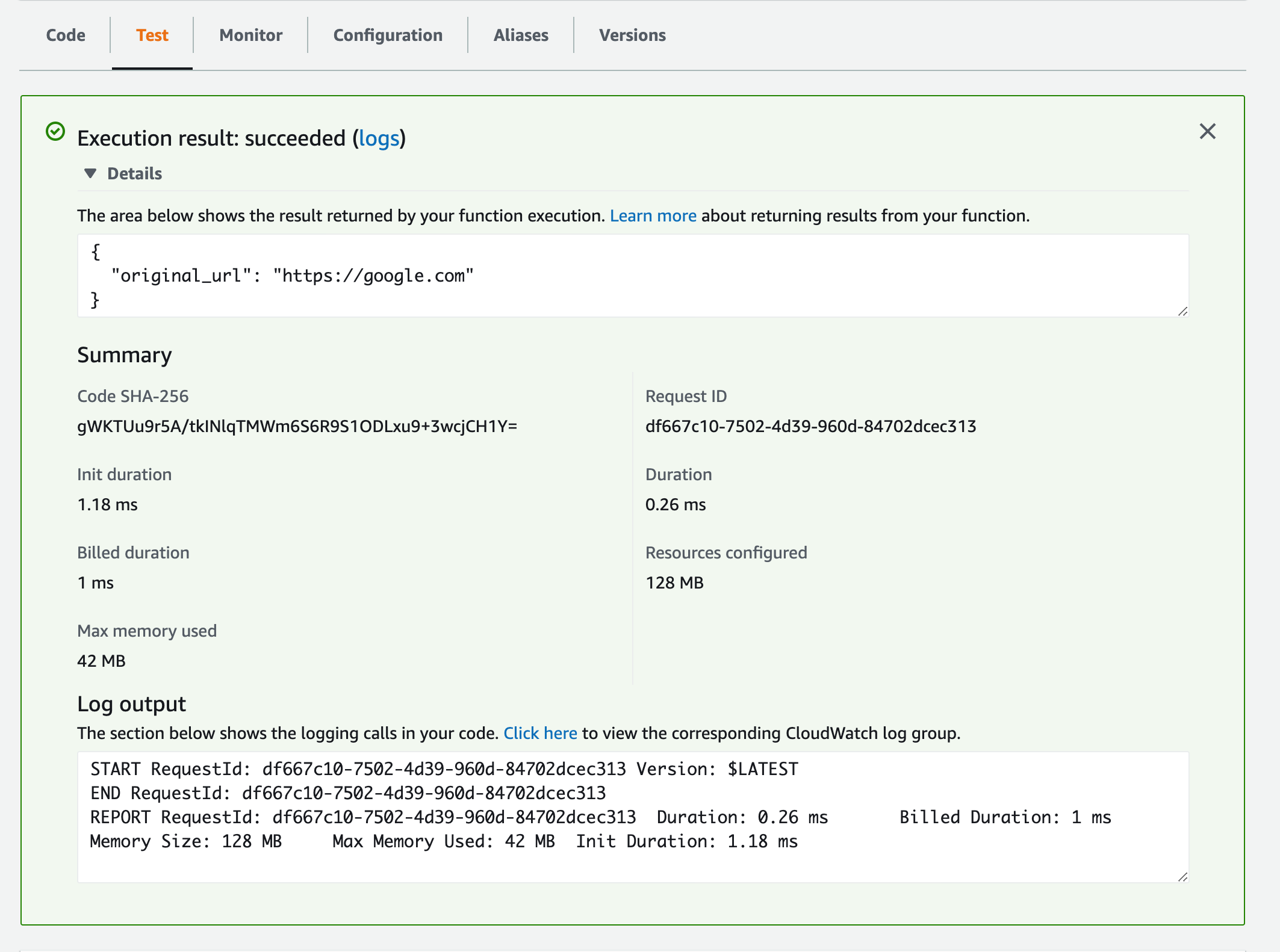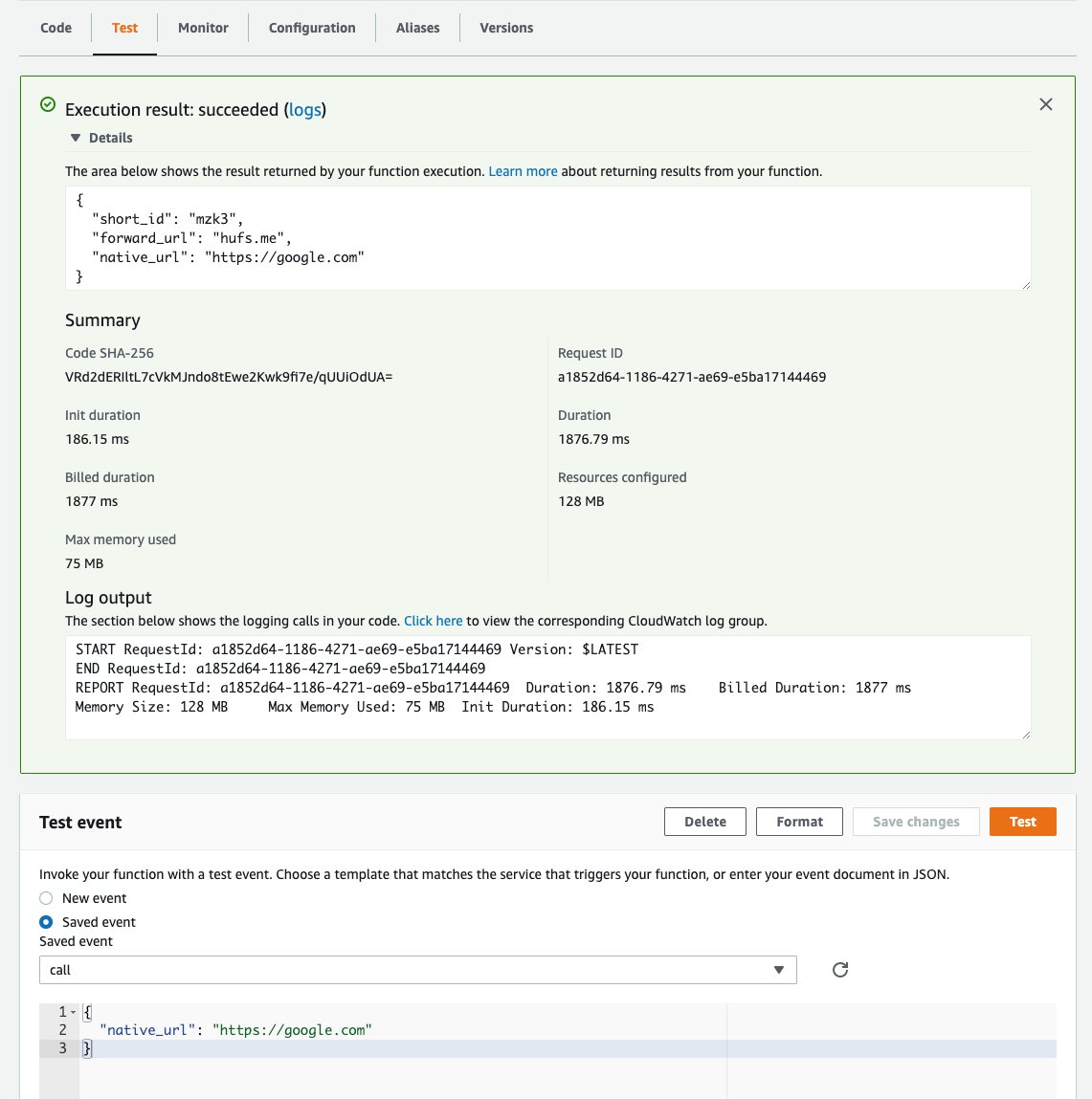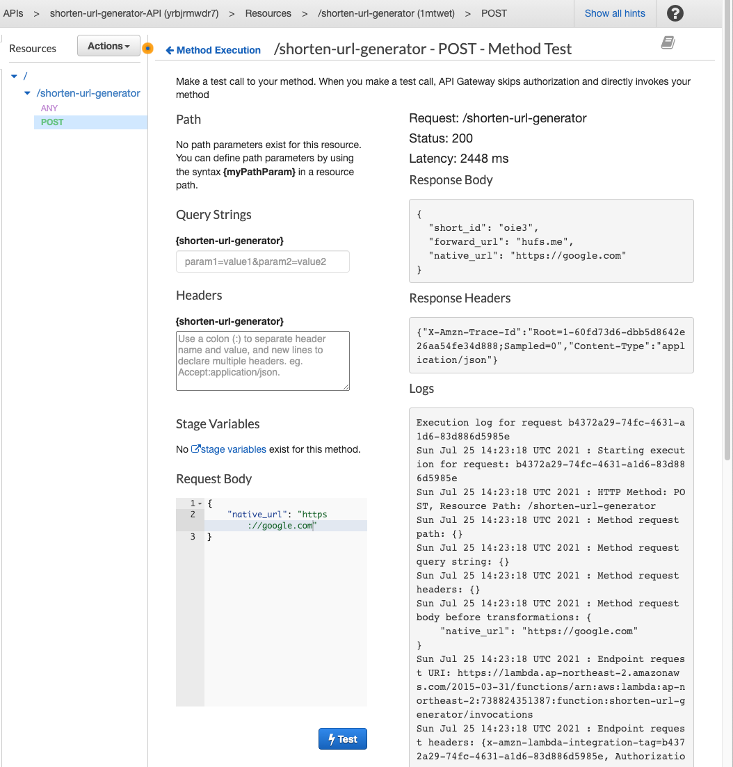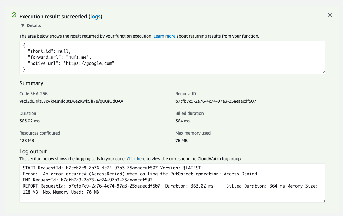 다시 Lambda 테스트를 해보니 성공적으로 우리가 원하는 short_id 값을 가지는 것을 확인해 볼 수 있다