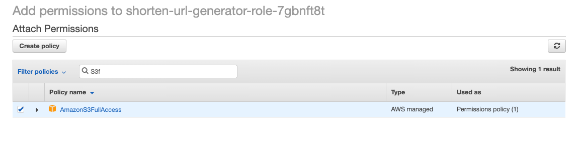 검색 창에서 AmazonS3FullAccess 를 검색하여 클릭한다. 그리고 하단의 Attach policy버튼을 눌러 추가한다