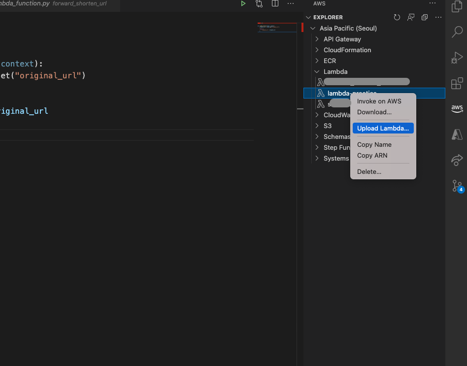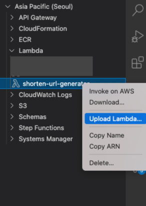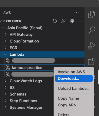 vscode의 AWS Toolkit 탭에서 해당 람다 함수 이름을 우클릭한다.