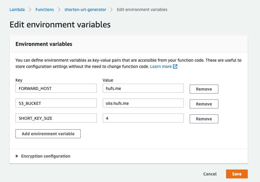 필요한 환경변수인 S3_BUCKET 과 SHORT_KEY_SIZE 값을 설정한다