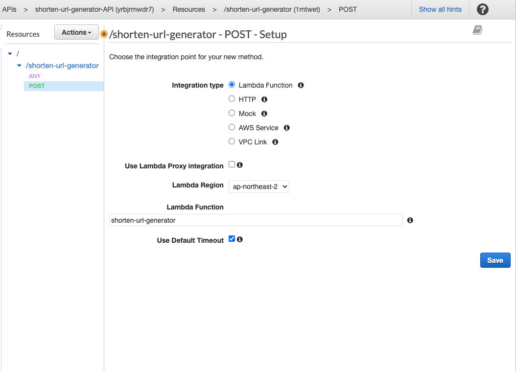 POST setup에서 Integration type은 Lambda Function으로 둔다.