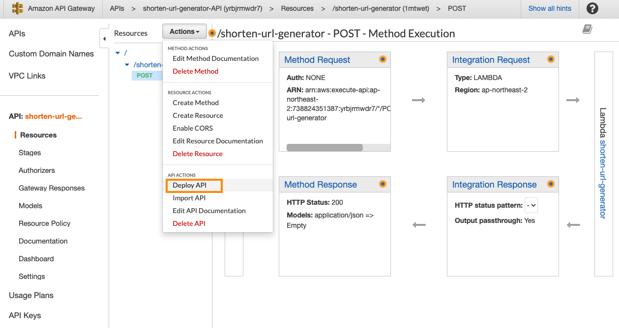 성공적임을 확인하였으니 Actions에서 Deploy API를 눌러 default stage에 배포를 한다