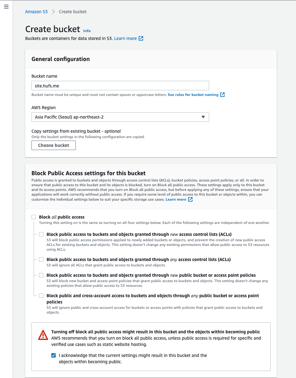 버켓의 이름은 우리가 이후에 만들 웹페이지 주소와 동일하게 두도록 한다.