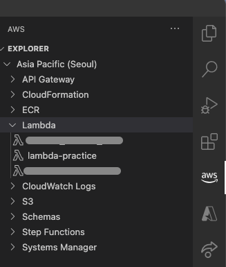 vscode에서 앞으로 작업할 프로젝트를 연 뒤에, AWS Toolkit의 Lambda를 확인해본다