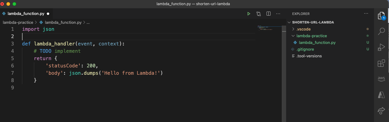 나의 경우, shorten-url-lambda 이름으로 프로젝트를 열었다