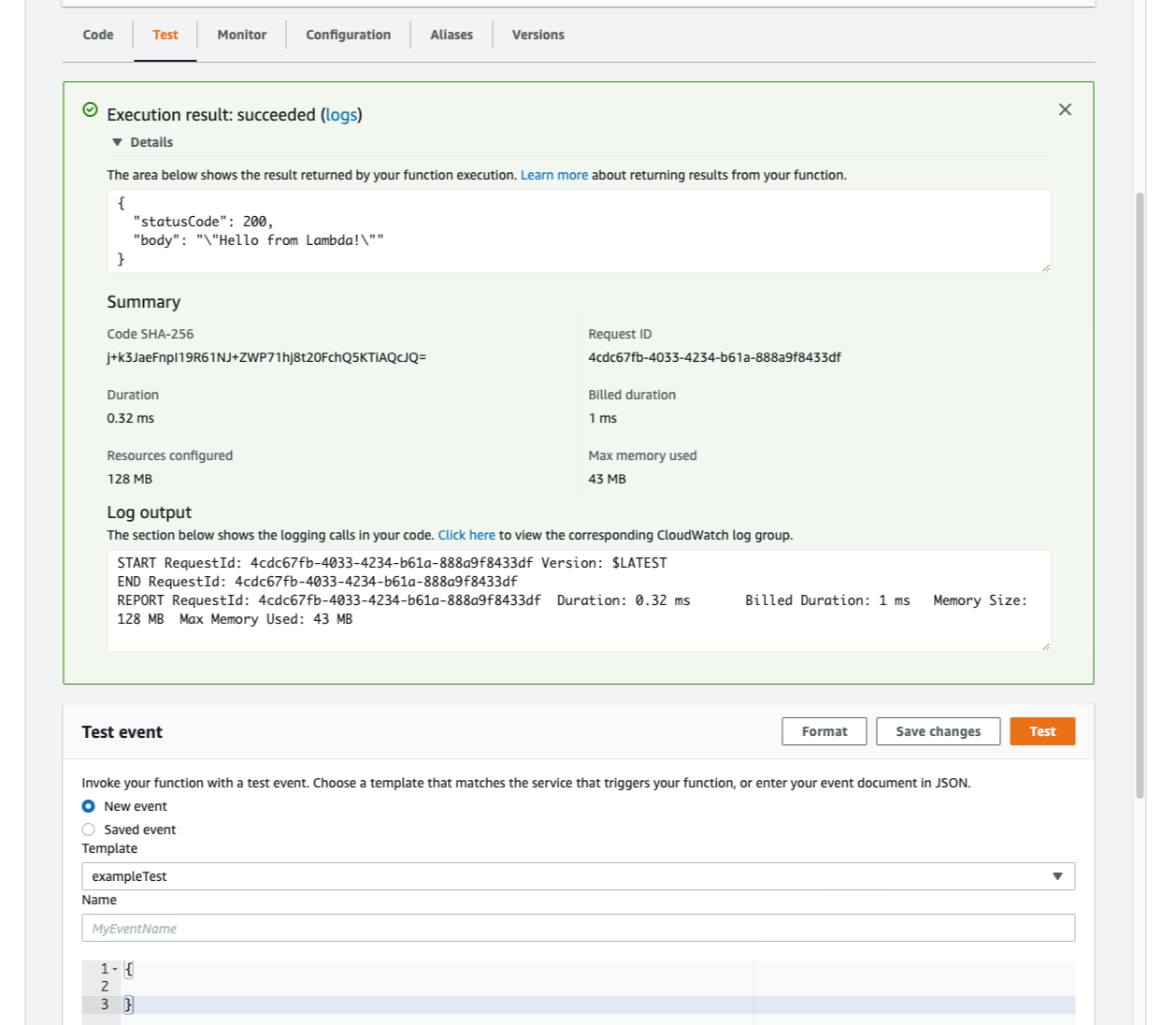 이제 위 코드가 어떻게 동작하는지 AWS Lambda 에서 테스트를 해본다
