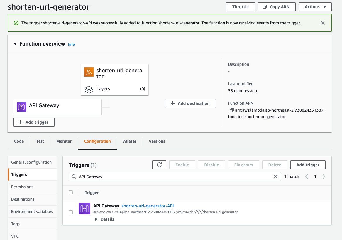 shorten-url-generator 람다 함수에서 Add Trigger를 선택한다.