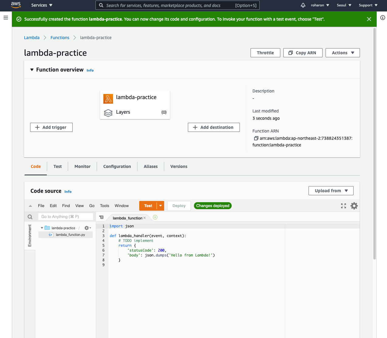 우리가 방금 만든 lambda-practice 함수가 나온 것을 볼 수 있다.
