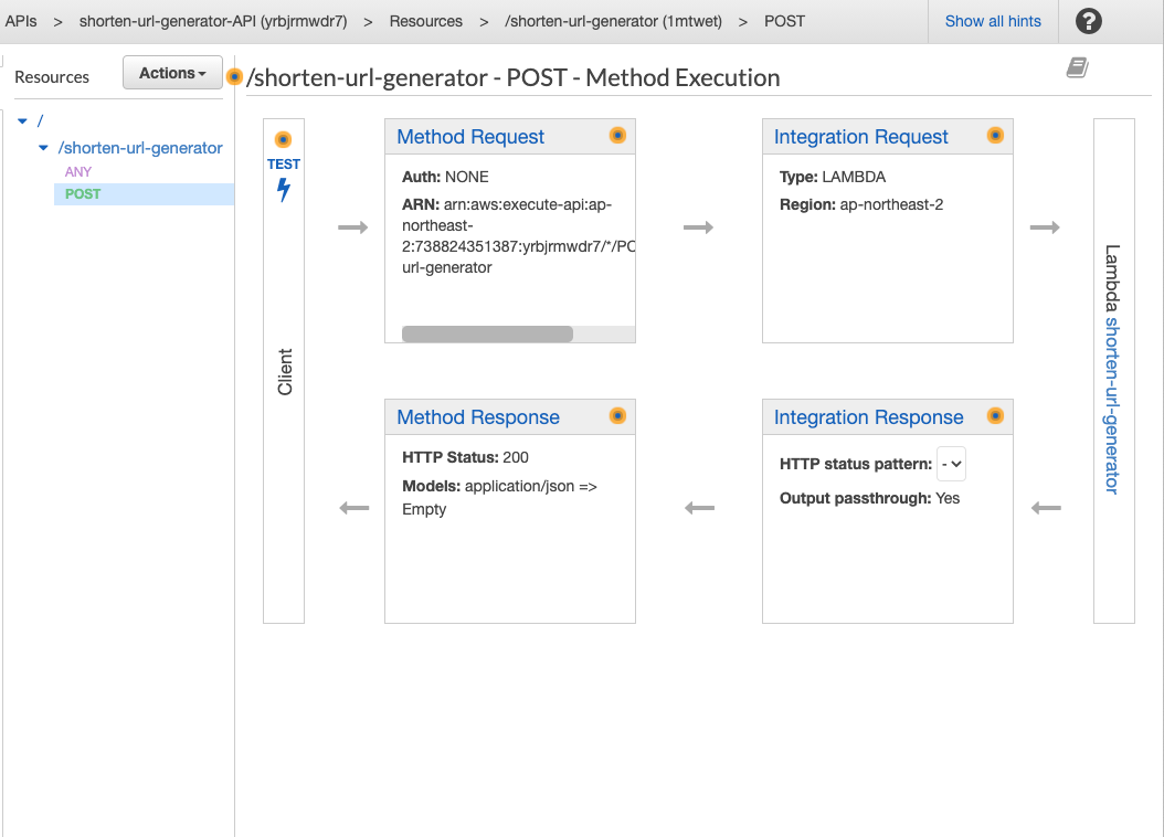 이것으로 단축 URL 생성 람다 함수 구현과 API Gateway연결을 마치면서 서비스 API의 한 부분을 완성하였다.