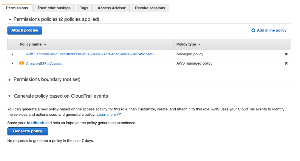 Source ARN로는 학습 환경에서의 편의를 위해 모든 S3 버켓에 접근할 수 있는 AmazonS3FullAccess 정책을 사용한다
