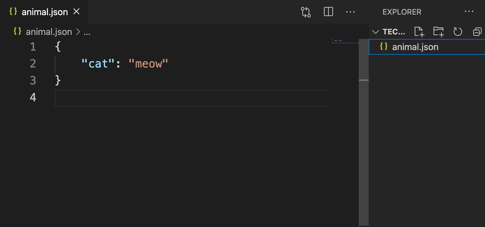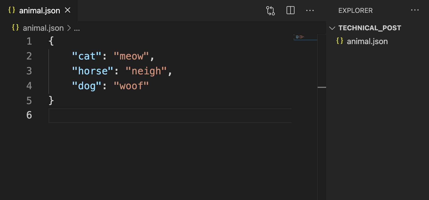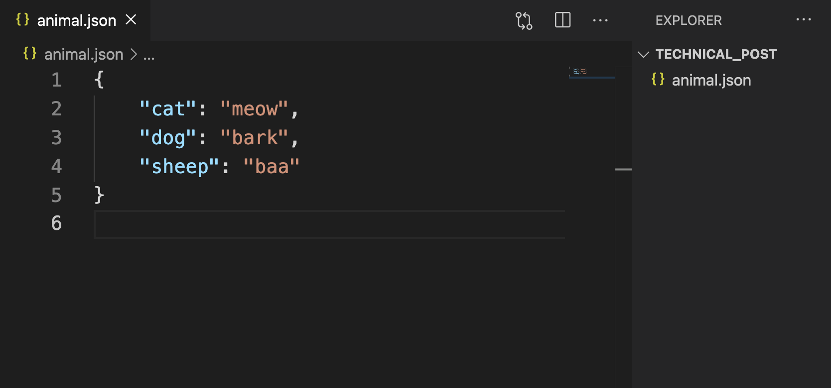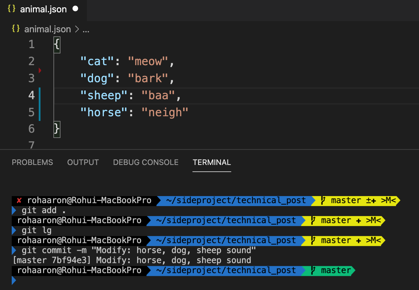 우선 git conflict가 발생하는 사례를 만들어보고자 동물의 울음소리를 정의하는 json을 생성해본다.