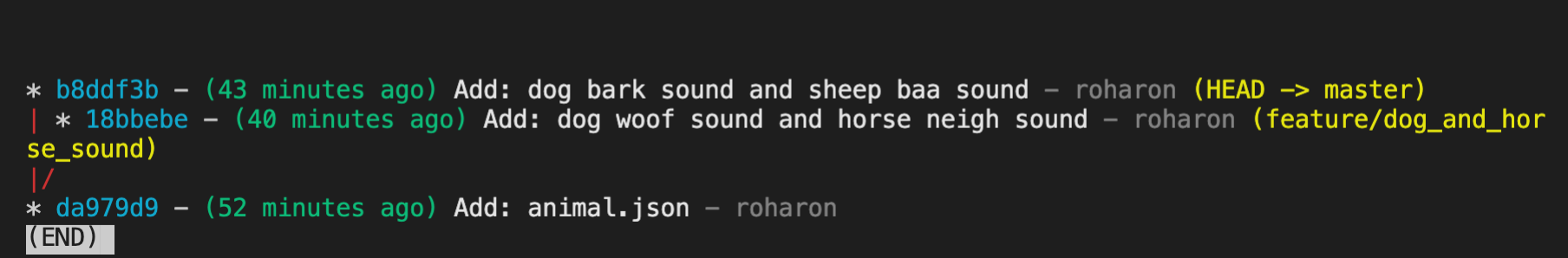 master 브랜치에서는 개에 대한 울음소리를 "bark"로 양에 대한 울음소리는 "baa" 로 정의하여 커밋을 한다.