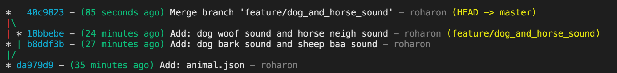 다음과 같이 Merge branch 'feature/dog_and_horse_sound' 메세지가 남아 master 브랜치의 히스토리만 보고도 어떤 브랜치에서 병합을 했는지 빠르게 파악할 수 있다