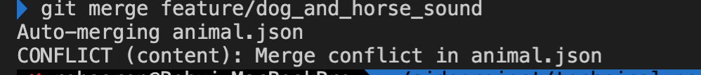 아마도 개에 대한 코드가 master와 feature/dog_and_horse_sound 브랜치에 모두 새롭게 정의되었으니 conflict가 발생하게 될 것이다.