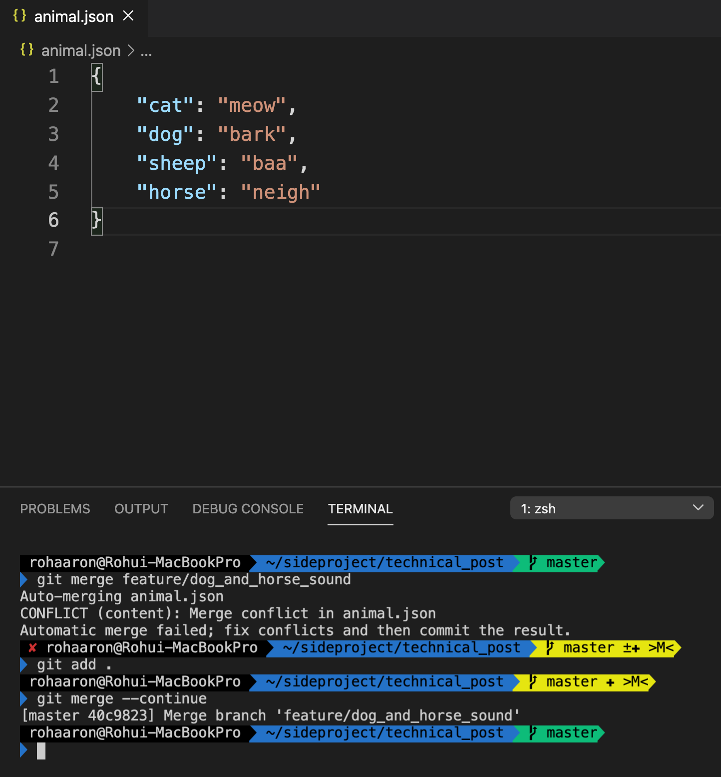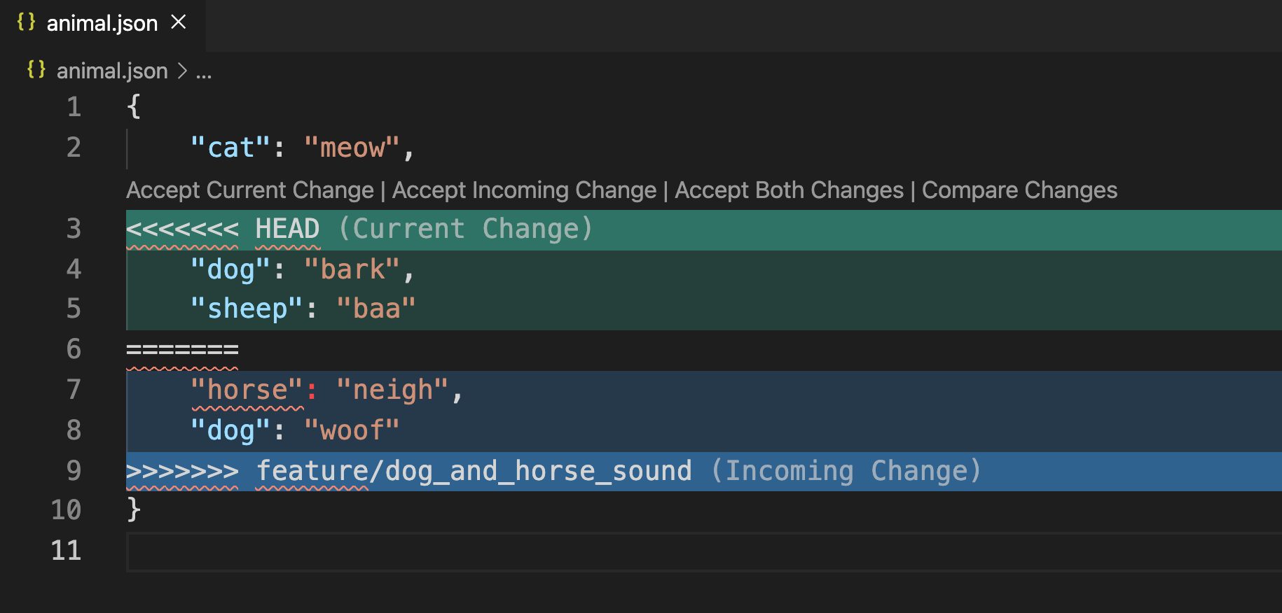 git merge feature/dog_and_horse_sound 로 브랜치를 병합하면 충돌이 나서 코드를 정리해야 하는 상황이 생긴다.