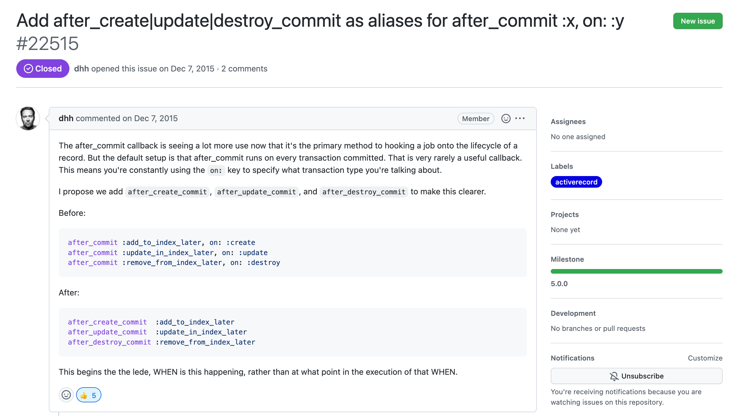 2015년도 12월에 after_commit 콜백에 대해서 명확하게 표현할 수 있는 alisas 메소드인 after_create_commit, after_update_commit, after_destroy_commit 를 Ruby on Rails 를 만든 David Heinemeier Hansson가 제안했다.